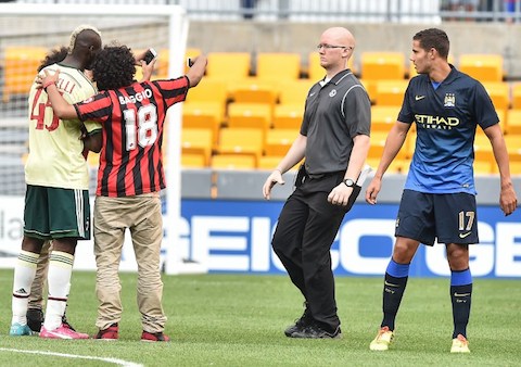 Ieri durante la sconfitta per 5 a 1 contro il Manchester City c’è stato un momento divertente, infatti due tifosi statunitensi hanno fatto una pacifica invasione di campo per farsi un Selfy con SuperMario Balotelli.
