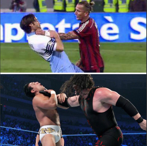 Il biondo francese è stato subito paragonato ad un famoso wrestler della WWE che è noto per la sua presa al collo devastante (chokeslam) e così il gioco è fatto! Mexes prende al collo Mauri e Kane prende Alberto Del Rio!