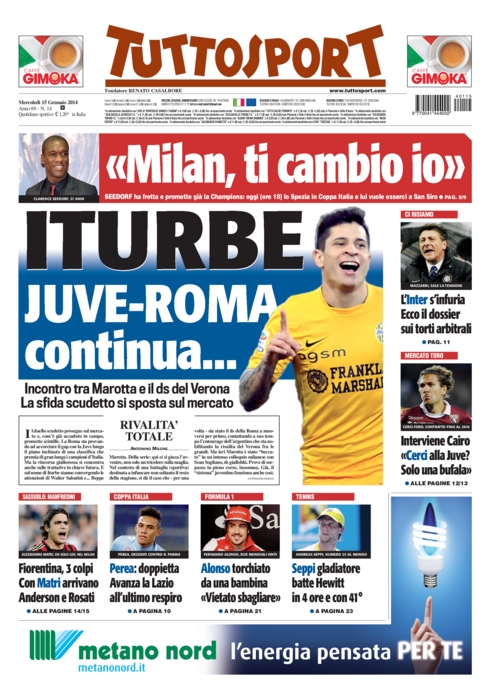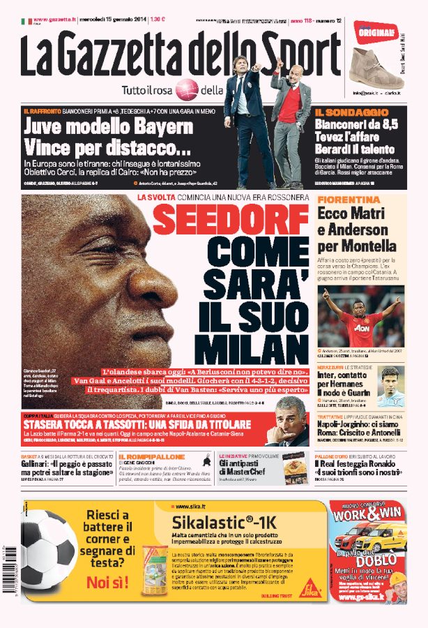 La Rassegna Stampa del 15.01.14. Le prime pagine sono tutte per Clarence Seedorf.